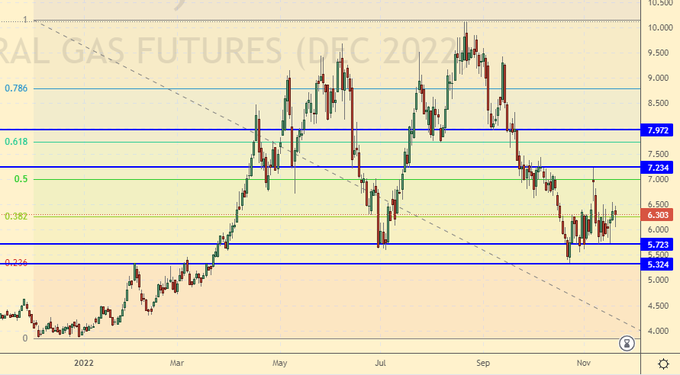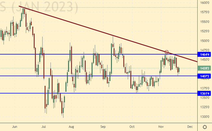 Сценарий роста: рассматриваем декабрьский фьючерс, дата экспирации 28 ноября. Пока мы стоим в диапазоне. Однако, пусть вниз на фоне естественного падения температур сейчас будут затруднен. Мы будем или стоять, или расти.