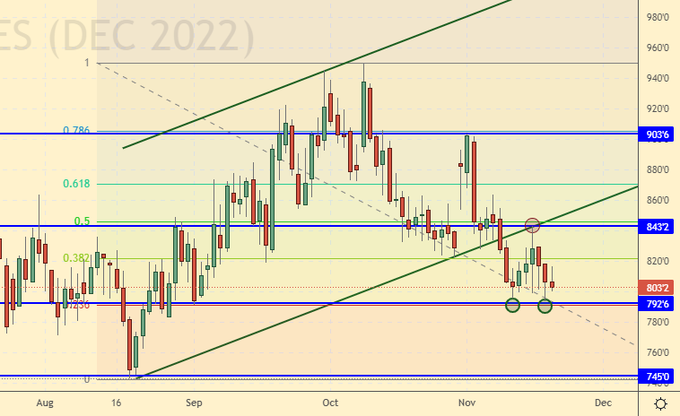 Сценарий роста: рассматриваем декабрьский фьючерс, дата экспирации 14 декабря. Продолжим рекомендовать покупки с текущих уровней. Если рынок не сможет пробиться ниже 790.0, то это приведет к сильному росту котировок.