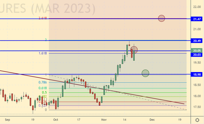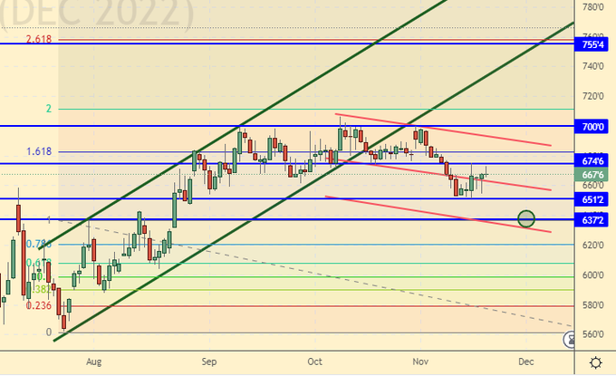 Сценарий роста: рассматриваем декабрьский фьючерс, дата экспирации 14 декабря. Пока мы не можем вырасти, оттолкнувшись от 650.0. Шансы на движение вверх остаются, но быкам надо быть более инициативными, иначе есть риск утратить преимущество.
