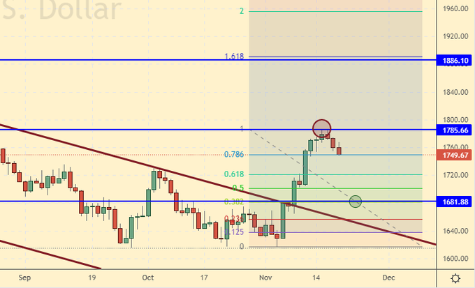 Сценарий роста: мы достигли первой цели на 1785. Сейчас должен последовать откат к 1680, после чего рост может быть продолжен.