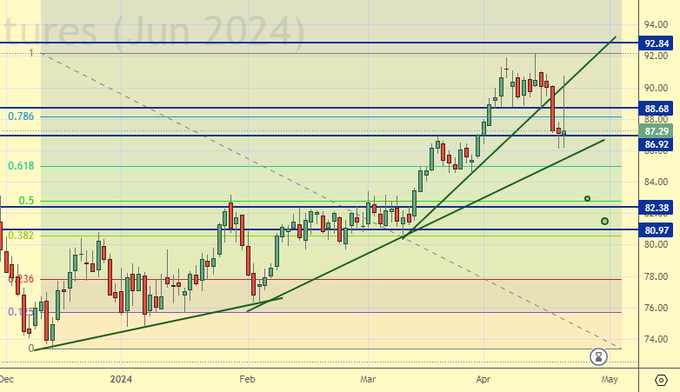 Сценарий роста: рассматриваем апрельский фьючерс, дата экспирации 30 апреля. Покупки не делаем. Ждем откат к 82.40 и 81.00.