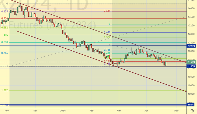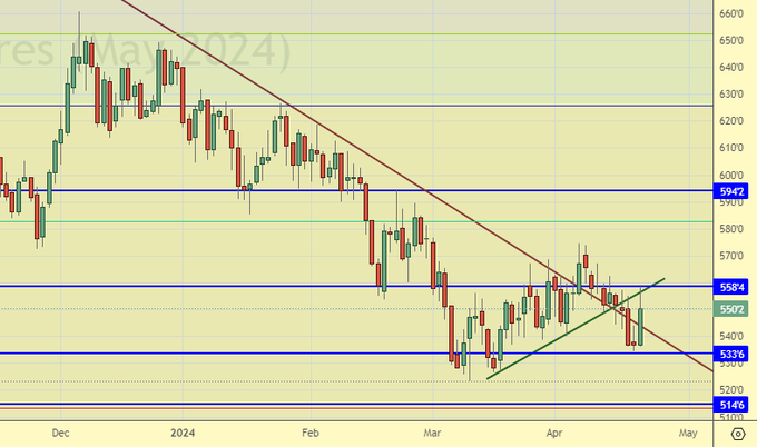 Сценарий роста: рассматриваем майский фьючерс, дата экспирации 14 мая. Очень у нас слабые надежды на продолжение роста. Перспективы по кукурузе хорошие несмотря на сокращение площадей в США.