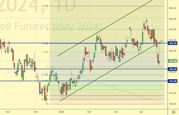 Сценарий роста: рассматриваем майский фьючерс, дата экспирации 10 мая. Можно купить. Лонг от 743.00, конечно, интереснее, но и эти уровни для покупок можно считать рабочими.