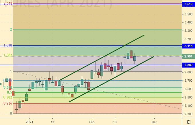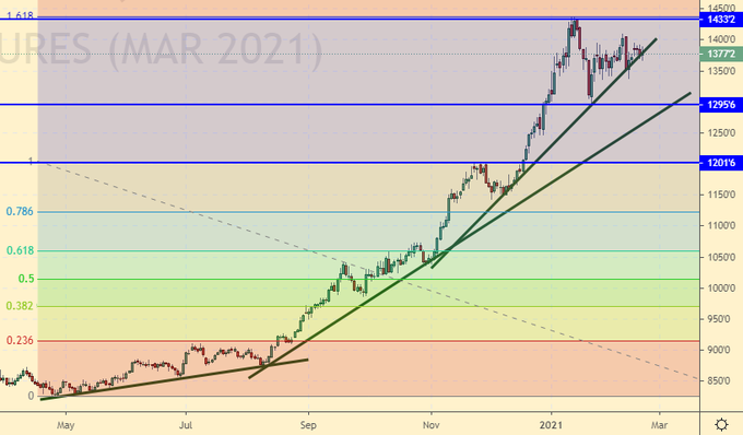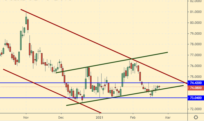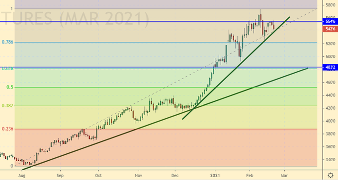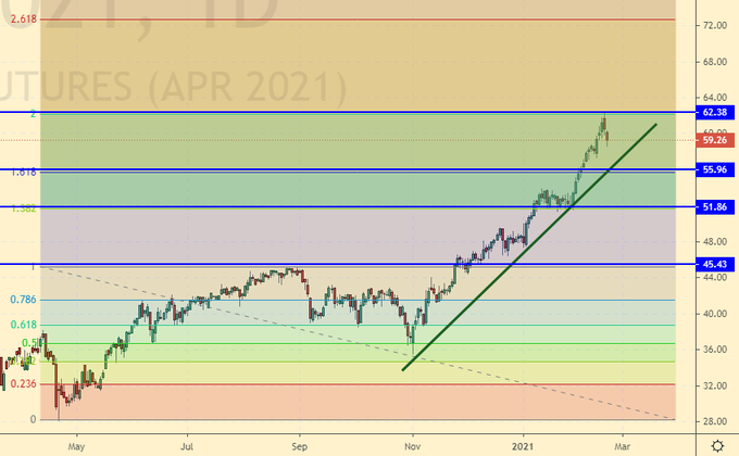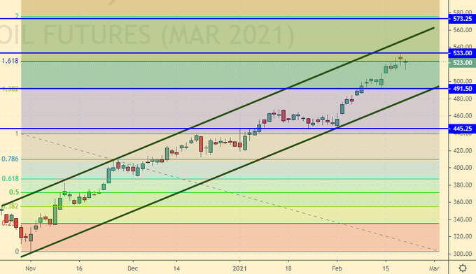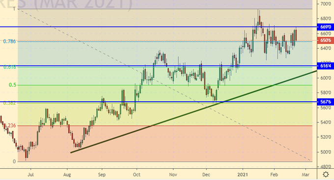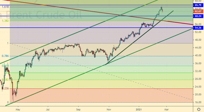 Рынок устал от собственного роста и предпочитает последние дни искать вариант для снижения. Падать не особо получается, так как морозная погода в Техасе способствовала сбою добычи. Сейчас ситуация выправилась. Холод отступил, температура вернулась к своим естественным значениям для этого времени года, то есть +15 по Цельсию.