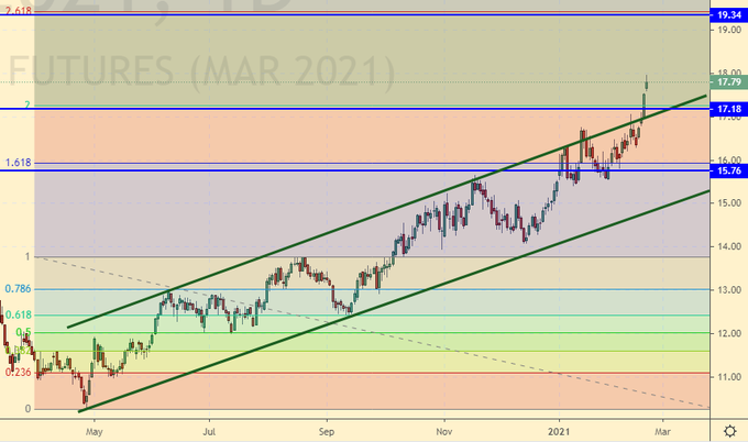 Сценарий роста: рассматриваем мартовский фьючерс, дата экспирации 26 февраля. Пробили верхнюю границу канала и пошли к 19.34. Такое бывает не так часто на крупных масштабах. Сейчас и при откате к 17.20 можно купить.