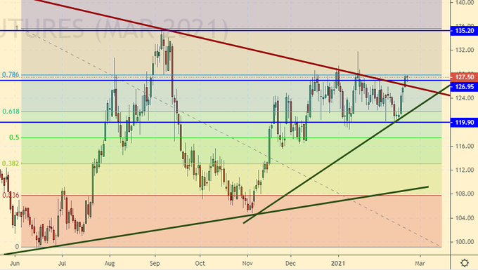 Сценарий роста: рассматриваем мартовский фьючерс, дата экспирации 19 марта. Ушли выше долгосрочной линии сопротивления. Откроем лонг, так как есть перспективы взятия 135.0.