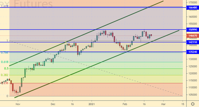 Сценарий роста: рассматриваем мартовский фьючерс, дата экспирации 18 марта. Быки держат рынок. Пока мы не можем отрицать возможности роста индекса в район 165000. Свечи обозначили поддержку на 142000. Можно купить на текущих уровнях.