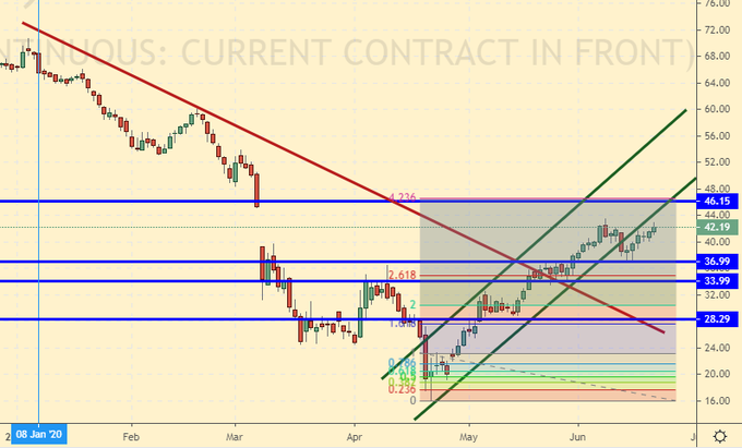 Падение добычи нефти в США ускорилось, -0,6 млн. баррелей за неделю до 10.5 млн. баррелей, это поддерживает рынок нефти на текущем этапе, однако вряд ли участники сделки (сговора) ОПЕК+ захотят видеть нефть на уровне выше 40.00 долларов, так как в этом случае сланцевая добыча в США быстро восстановится. На рынке нефти будет еще одна неделя роста, после чего цены перейдут к падению. Технически для очередного витка снижения цен всё готово.