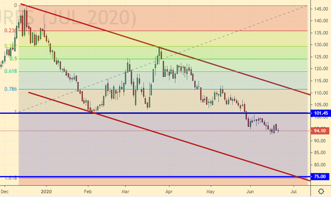 Сценарий роста: рассматриваем июльский фьючерс, дата экспирации 21 июля. От безысходности продолжаем рассуждать о падении рынка к 75.00. Если рынок неожиданно вернется выше 102.0 будем думать о покупках. От 75.00 нужно агрессивно покупать.