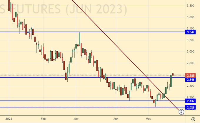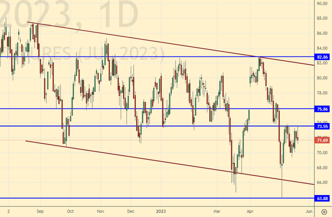 Спекуляции по поводу повышения потолка госдолга в США, что в случае неудачи может привести к заморозке работы правительственных учреждений, не утихают. До конца мая деньги есть, а там посмотрим. Вряд ли нынешняя американская элита готова разрушить собственное государство. Следим за данной ситуацией. Если о повышении потолка госдолга вдруг не договорятся, то тогда рынок нефти может сильно снизится на моменте. Цели могут быть как на 66.00, так и на 50.00.
