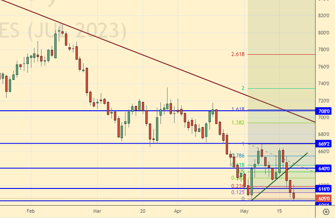 Сценарий роста: рассматриваем майский фьючерс, дата экспирации 12 июня. Продолжаем ждать падения к 600.0. Когда это произойдет можно будет купить.