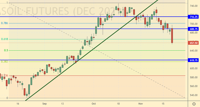 Сценарий роста: рассматриваем декабрьский фьючерс, дата экспирации 10 декабря. Ждем прихода цен в район 615.00, там и будем думать о покупках.