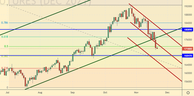 Сценарий роста: рассматриваем декабрьский фьючерс, дата экспирации 16 декабря. Индекс не смог удержаться выше 176000 и пошел вниз. Не исключено, что западные инвесторы сбрасывают российские бумаги, так как готовятся к проблемам у себя дома. Не покупаем.