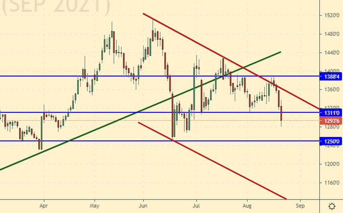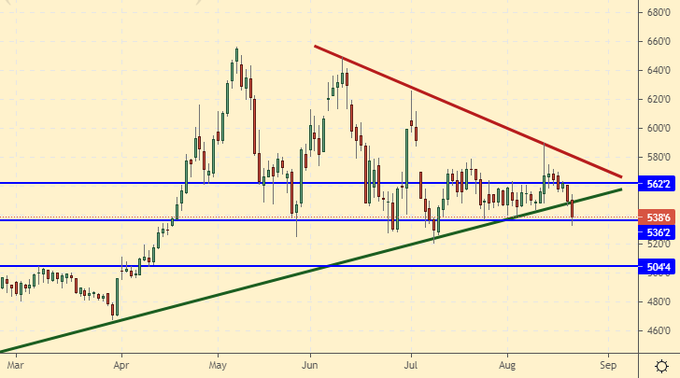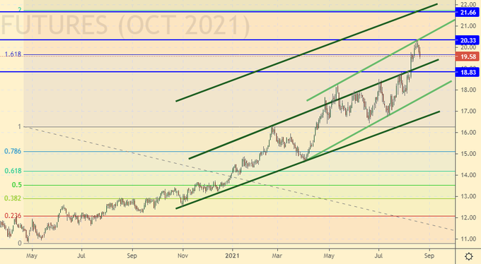 Сценарий роста: рассматриваем сентябрьский фьючерс, дата экспирации 20 сентября. Выброс цен от 160.00 к 215.00 пока является основным бычьим событием. Рынку будет непросто уйти ниже 170.00, поэтому держим лонг в расчете на возобновление роста.