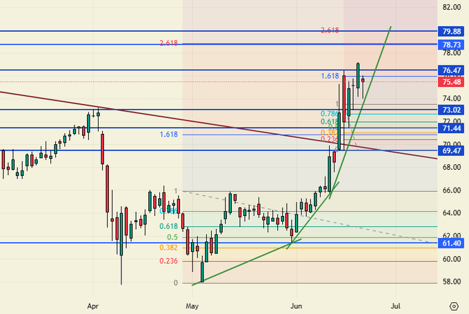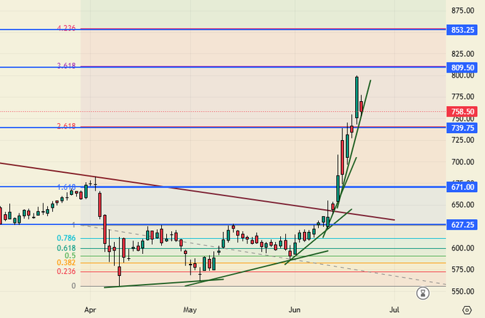 Сценарий роста: рассматриваем августовский фьючерс, дата экспирации 31 июля. Улетели наверх. Могут ли вернуться? Только если Иран сдастся, а это сейчас вряд ли возможно. Удобных уровней на покупку нет.