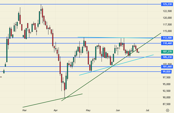Сценарий падения: думать в случае падения ниже 105000. Ничего другого здесь предложить нельзя. Нам нужно увидеть выход из консолидации в одну из сторон.