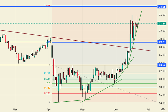 Сценарий роста: перешли на августовский фьючерс, дата экспирации 29 июля. Кто в позиции, держите лонги. Если Иран начнет топить всё, что движется, то это приведет к глобальному стрессу для рынка.