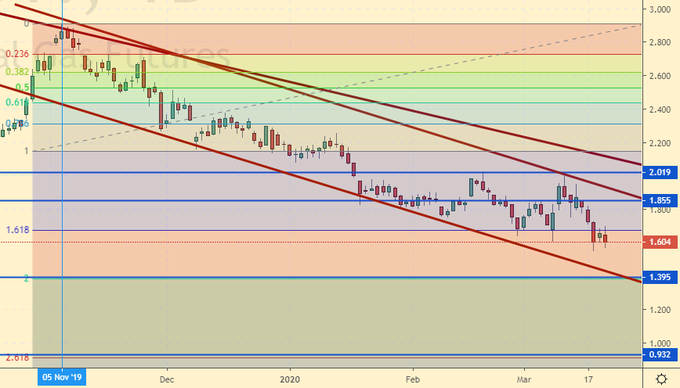 Сценарий роста: рассматриваем апрельский фьючерс с датой экспирации 27 марта. Вернулись к 1.60 и претендуем на продолжение падения. Думать о покупках будем после роста выше 2.000 или при подходе к 1.000.