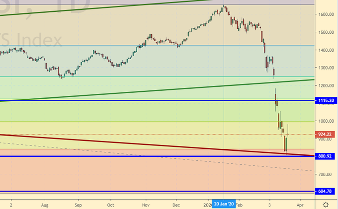 Сценарий падения: продолжаем считать, что шорт от района 1100 — 1200 это рабочая мечта в текущей ситуации. Нам грозит уже не 800.0, уже 600.0.