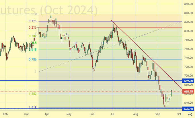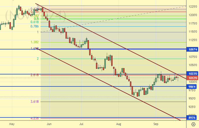 Сценарий роста: рассматриваем ноябрьский фьючерс, дата экспирации 14 ноября. Учитывая рекордный валовый сбор по сое, расти нам будет очень тяжело. Не покупаем.