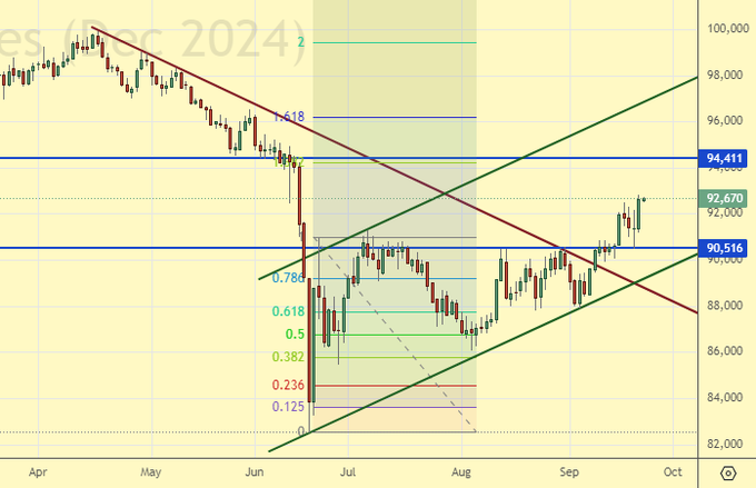 Видим постепенное ослабление рубля. Подъем пары к 94.00 практически не вызывает сомнений. Дальнейший рост также будет возможен, но будет носить плавный размеренный характер при условии, что не будет объявлена вторая волна мобилизации и не будут резко увеличена расходная часть бюджета на 25-й год. И по первому, и по второму условию есть обоснованные подозрения, что оба будут иметь место. В этом случае нас будет ждать рост в район 104.00 к концу года и этот курс продержится до конца марта года 25-го.