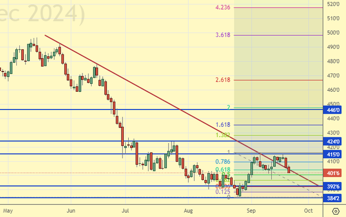 Сценарий роста: рассматриваем декабрьский фьючерс, дата экспирации 13 декабря. Пока мы ниже 445.0 риск падения к 360.0 остается. Интересно купить от 393.0.