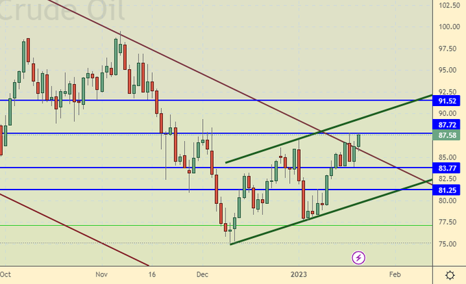 Продажа: нет. Кто в позиции от 85.00, перенесите стоп на 88.30. Цель: 55.00 (45.00?!!!) долларов за баррель.