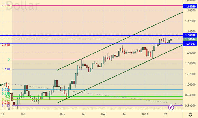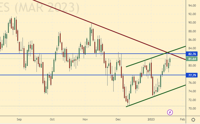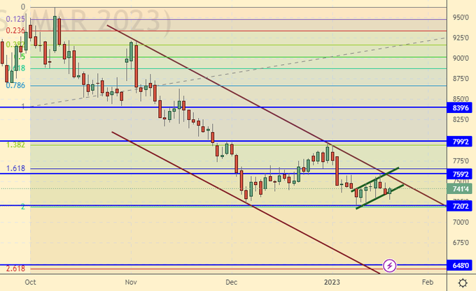 Сценарий роста: перешли на мартовский фьючерс, дата экспирации 21 февраля. Растем. Продолжаем держать лонги открытые две недели назад. В случае роста выше 84.00 можно нарастить позиции.