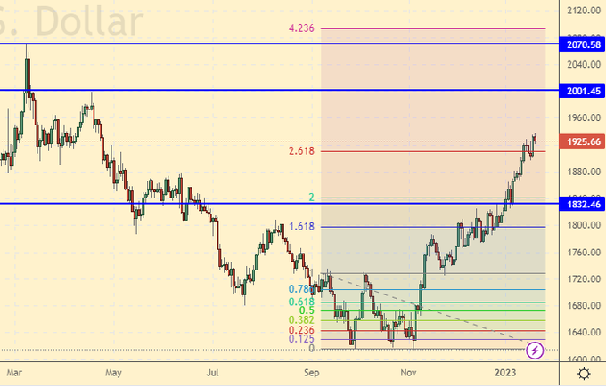 Продажа: сейчас. Стоп: 1939. Цель: 1800 долларов за тройскую унцию.
