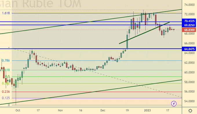 Российская валюта без всякого сомнения будет испытывать сильное давление в течение всего 23-го года. Снижение выручки от продажи углеводородов способно привести к тому, что дефицит бюджета достигнет 6 трлн. рублей. (это пессимистичная оценка, но она имеет право на существование уже сейчас). Дефицит будет покрываться за счет фонда национального благосостояния, за счет продажи валюты, за счет дополнительного налогообложения предприятий способных генерировать прибыль и в конечном счете за счет включения печатного станка. К последнему средству прибегать не придется, если скидка на российскую нефть и нефтепродукты сократится.