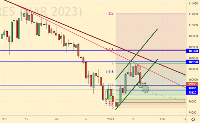 Сценарий роста: рассматриваем мартовский фьючерс, дата экспирации 16 марта. Участники рынка, наконец, осознали, что прибыли у компаний нефтегазового сектора в этом году не будет. Даже если что-то удастся заработать, правительство все излишки отберет. Рост в ситуации тотального сбора с предприятий, даже не налогов, а просто всей прибыли, возможен только в случае роста цен на нефть в район 150 долларов за баррель. Отметим что район 98000 — 99000 привлекателен для покупок с технической точки зрения. Нам придется войти в лонг с близким стоп-ордером.
