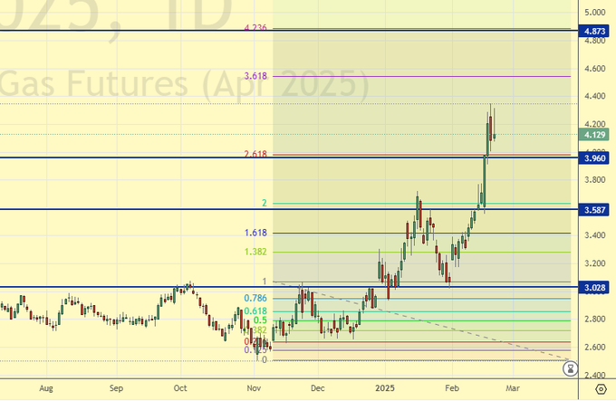 Сценарий роста: рассматриваем апрельский фьючерс, дата экспирации 27 марта. Можно держать позиции. Холода в США приводят к росту спроса на газ.
