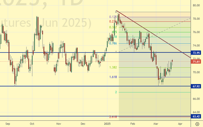 Ирану дали два месяца на принятие католицизма… нет, извините, на заключение ядерной сделки. Скорее там все примут христианство, чем подпишут сделку, честное слово. Но в целом, можно было бы принять Православие. А почему нет. Не надо быть ясновидящим чтобы понять, что рынок нефти будет тяготеть к падению, на фоне плохих экономических настроений, вон Баффет давно в наличности сидит, а политики периодически будут его продергивать наверх. Что получаем? Получаем широкий канал вниз с возможной целью… 50.00. А что? Круглое число. Но это ближе к августу, скорее. Спрос к концу года на нефть традиционно растет, там рынок должен будет выправиться.