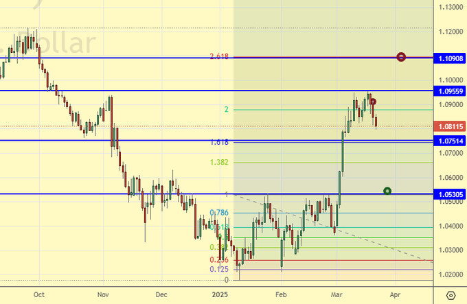 Сценарий падения: наши разворот в не очень понятном месте. Хотим 1.0550. Трамп может укрепить доллар создаваемым им же хаосом.