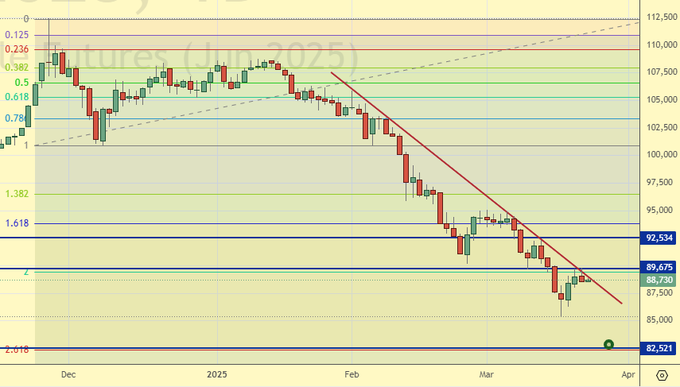 Сценарий роста: рассматриваем июньский фьючерс, дата экспирации 19 июня. От 82600 покупать однозначно. Рост выше 91000 заставит задуматься о покупках после пробоя линии падающего тренда.