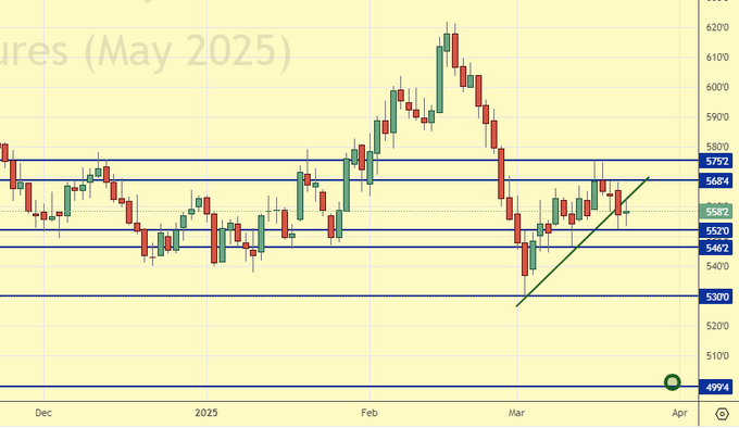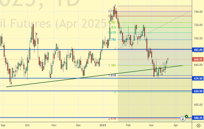 Сценарий роста: рассматриваем апрельский фьючерс, дата экспирации 9 апреля. Продолжаем считать, что для покупок надо подождать, когда полностью отработает импульс вниз, а это случится, возможно, на уровне 580.0.
