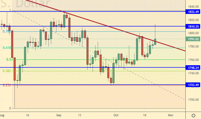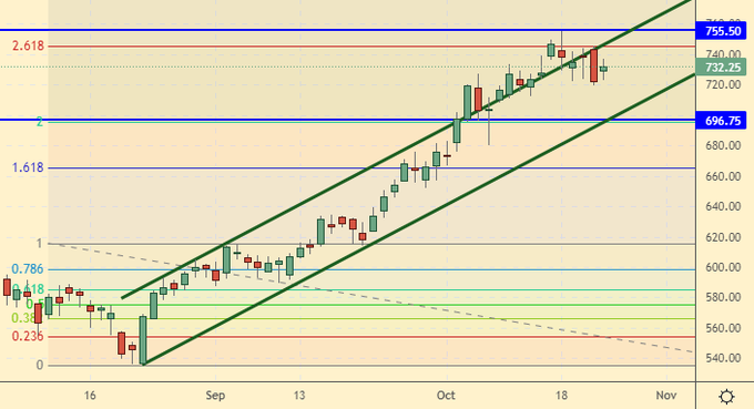 Сценарий роста: рассматриваем ноябрьский фьючерс, дата экспирации 11 ноября. Не смогли мы подняться 750.0. Пока вне рынка.