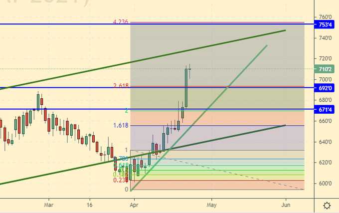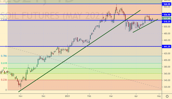 Видим, что быки полностью контролируют рынок зерновых. Идет разгон цен перед майским заседанием USDA. Скорее всего, после бурного роста рынок в мае откатит вниз. А вот глубина отката будет зависеть от погодных условий. Напомним, что, судя по тому, что спрос практически догнал по объему валовый сбор, рынок от крайне высоких цен спасет только рекордный урожай зерновых. А он уже под вопросом, по крайней мере в США, во многих штатах банально холодно и сухо.