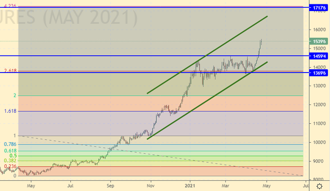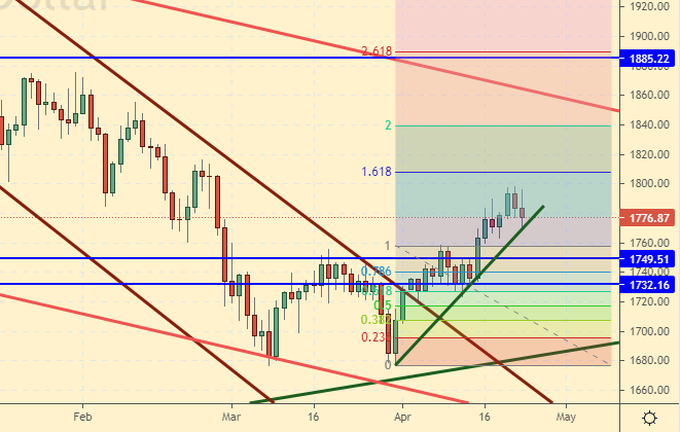 Сценарий роста: рассматриваем майский фьючерс, дата экспирации 14 мая. Мы действительно пошли на 1700. Вы должны быть в лонгах от 1470. В соответствии с нашими рекомендациями.