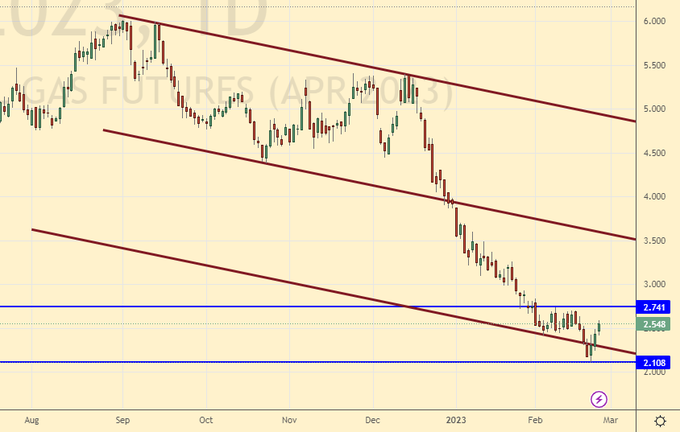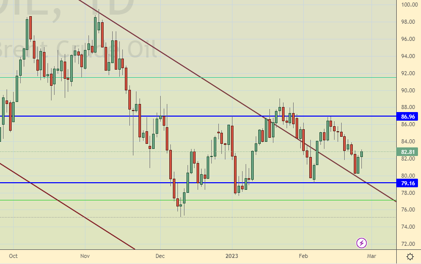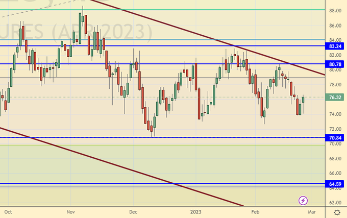 Очень много разговоров о возрождении Китая, но нефть расти не торопится. Более того, появилась угроза падения ниже уровня 80, что может привести к быстрому падению цен 10 процентов на фоне разочарования быков тем фактом, что Россия как поставляла нефть, так и поставляет. Ни о каком дефиците предложения речь сейчас не идет. Все недовольны, но продолжают работать. С красными лицами продают, с серыми лицами покупают.