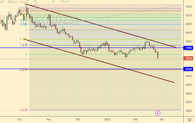 Продажа: нет. Кто в позиции от 688.0, перенесите стоп на 678.0. Цель: 580.0 центов за бушель.