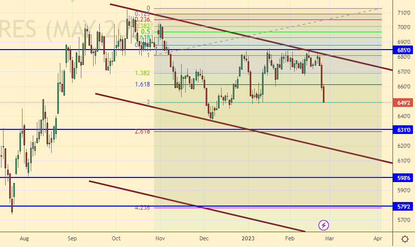 Сценарий роста: рассматриваем мартовский фьючерс, дата экспирации 16 марта. В ближайшее время никто не сможет рассчитывать на налоговые послабления. Каждая крупная выплата дивидендов будет рассматриваться налоговиками под микроскопом. Не будет дивидендов, не будет интереса к рынку. Пока расти нам не на чем. Не покупаем.