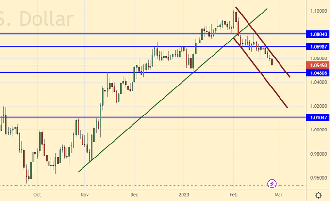 Сценарий роста: притормозили падение. Скорее всего мы дойдем до 1.0480. Если падение не остановится, то мы можем пройти к 1.0100, это надо учитывать.