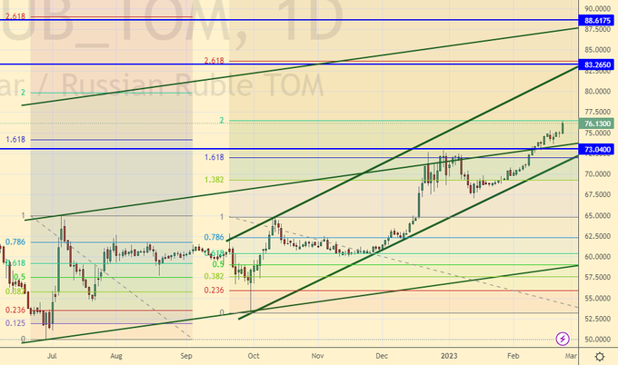 Если на следующей неделе не будет отката от уровня 76.00, предположительно в район 72.00, то стоит готовится к тому, что пара доллар/рубль быстро поднимется к уровню 80.00.
