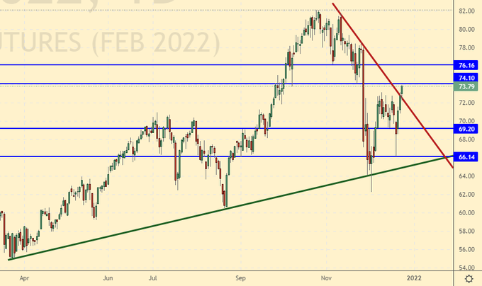 Нельзя не сказать о ценах на природный газ в Европе. 800 миллионов человек прониклись великой любовью к своим политикам и экономистам, многие из которых лауреаты Нобелевских премий. И пик этой любви еще не наступил. Если цены в 1000 долларов за 1000 кубометров газа продержатся январь и февраль, то в марте, подгоняемые весенними гормонами, околевшие жители Лондонов и Парижей начнут разводить костры в зданиях местных администраций. Предвидя такое дело, атомную энергетику по-быстрому и по-тихому в Европе признали «зеленой», будем надеяться, что это поможет, а если нет, то ждем акции компании ГАЗПРОМ на уровне 480 рублей.