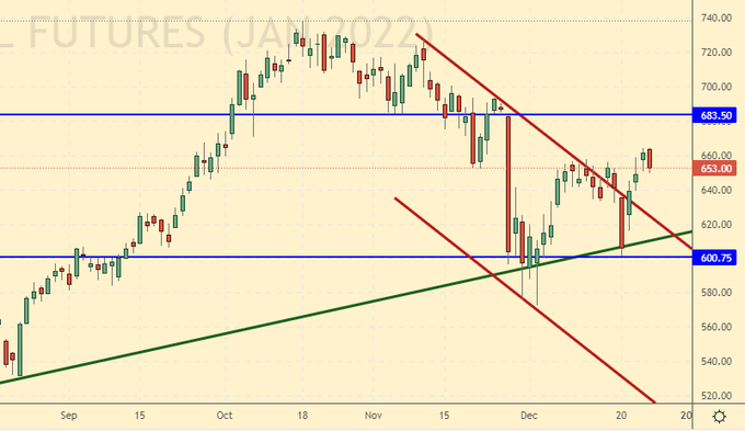 Сценарий роста: рассматриваем январский фьючерс, дата экспирации 12 января. В рост выше 690.0 верится с трудом. Воздержимся от покупок.