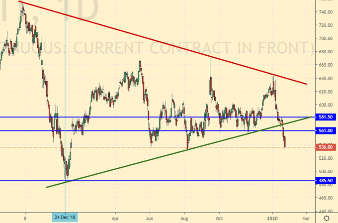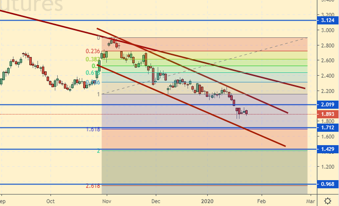 Сценарий роста: рассматриваем мартовский фьючерс с датой экспирации 26 февраля. Первый уровень поддержки у нас на 1.712, но он только первый. Учитывая то, что война за газовый рынок Европы только набирает обороты, и всё это происходит на фоне теплой зимы, ждать роста цен не приходится. Пока не покупаем.