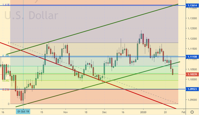 Сценарий роста: ЕЦБ оставил ставки без изменений, то есть на нуле. Были вскользь обозначены некоторые реформы, но в них рынок не поверил. Мы вышли из растущего канала вниз. Пробой 1.1000 будет означать слом надежд на то, чтобы увидеть евро в этом году на 1.2000. 29-го января заседание ФРС, однако евро это вряд ли поможет.