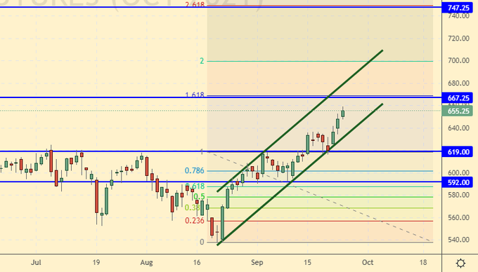 Сценарий роста: рассматриваем октябрьский фьючерс, дата экспирации 12 октября. Не исключено, что рынок откатит от уровня 667.0. Если это произойдет, то можно будет рассмотреть возможности для покупок. Пока вне рынка.