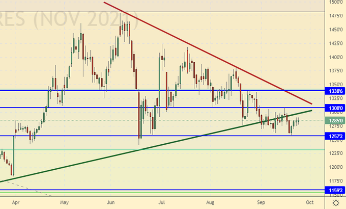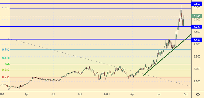 Сценарий роста: рассматриваем октябрьский фьючерс, дата экспирации 28 сентября. Рынок газа в Европе продолжает оставаться на высоких, можно даже сказать запредельных уровнях. Покупать сейчас крайне некомфортно. Пока будем рассчитывать на нормализацию ситуации и откат к 4.220.